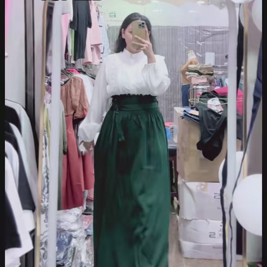 Stylish Design: Features a chic white bodice with ruffle accents and delicate pearl buttons for a refined, feminine touch.