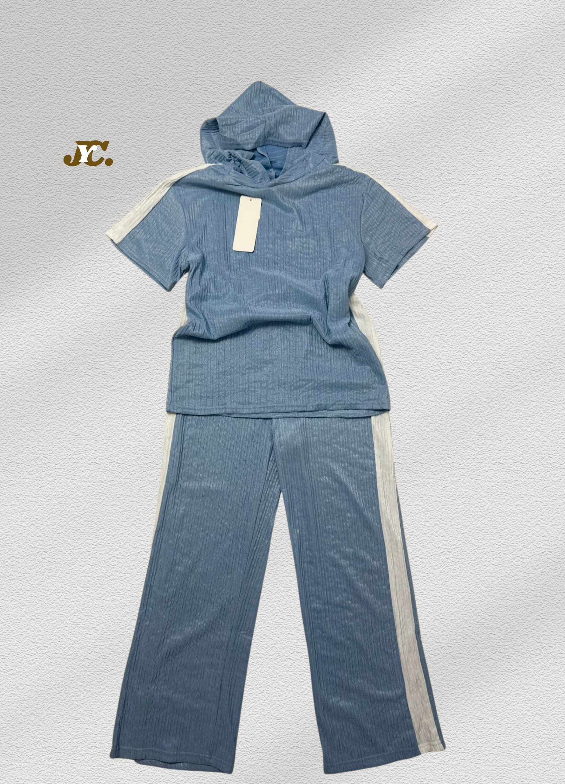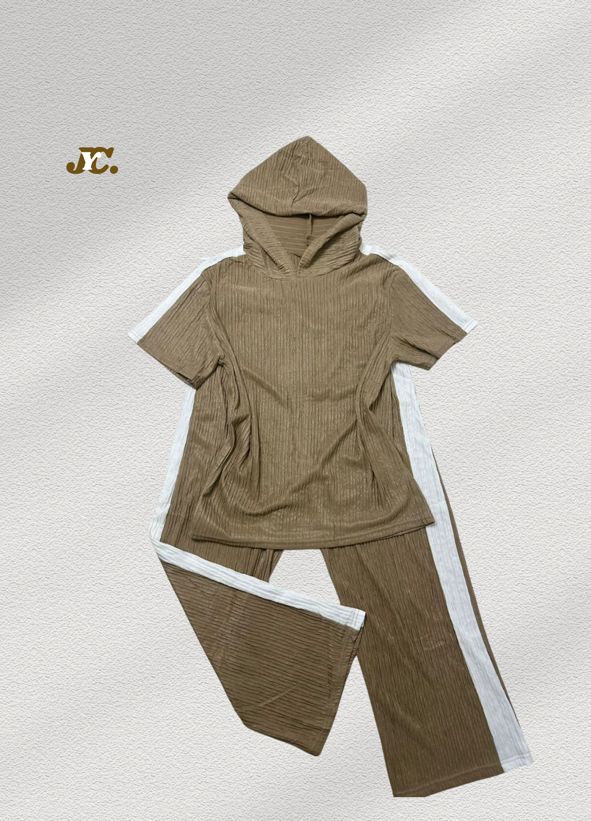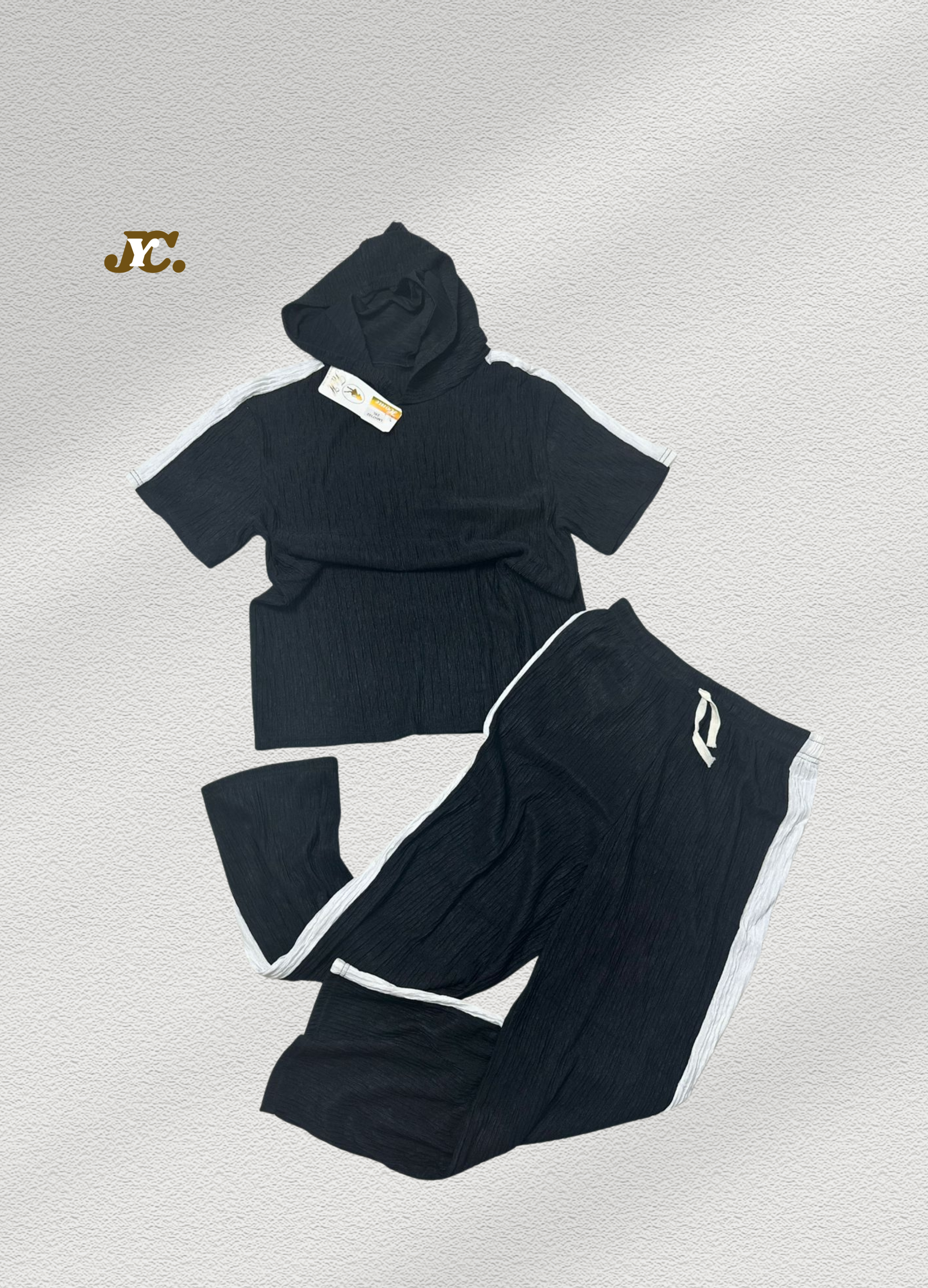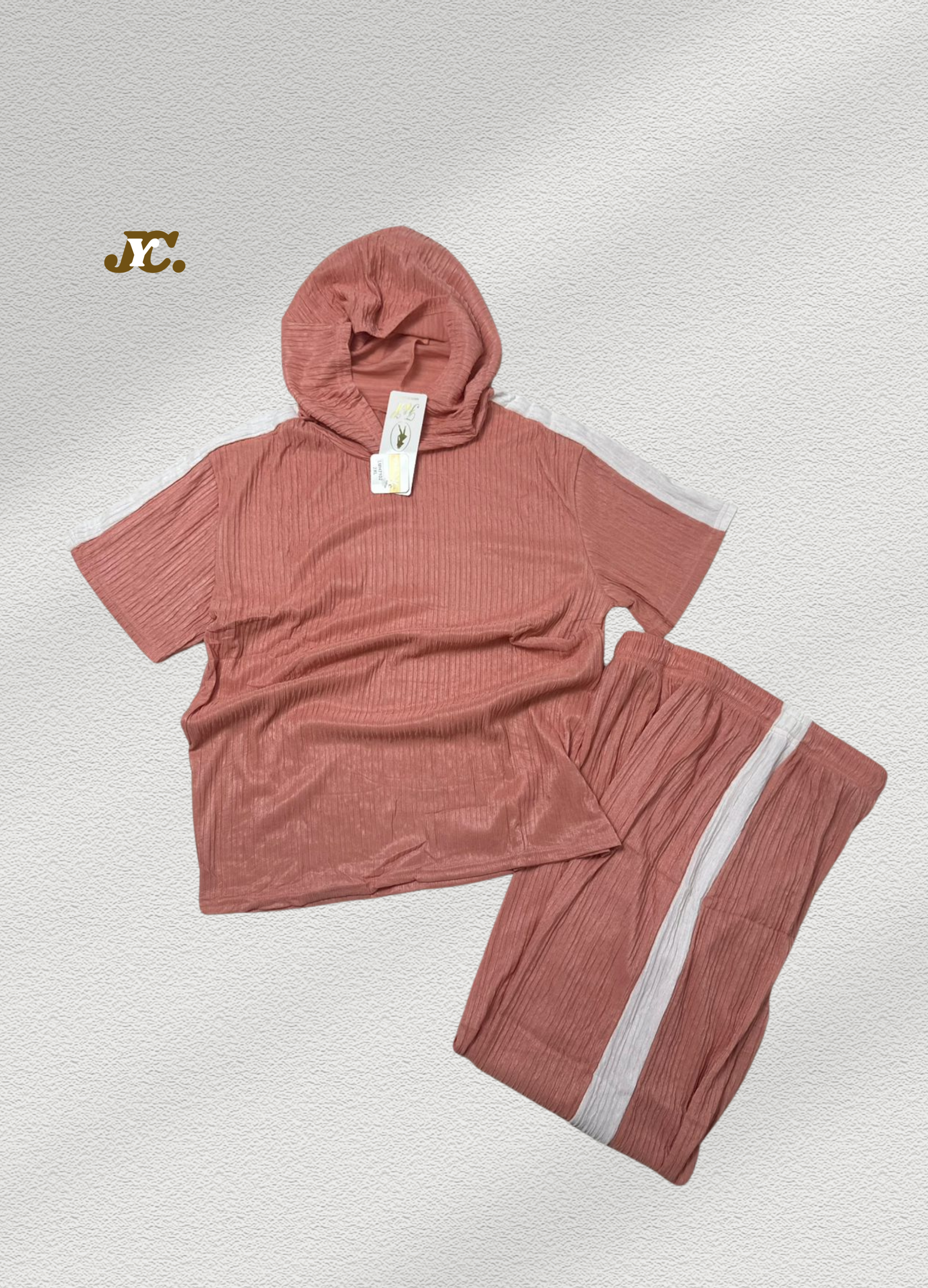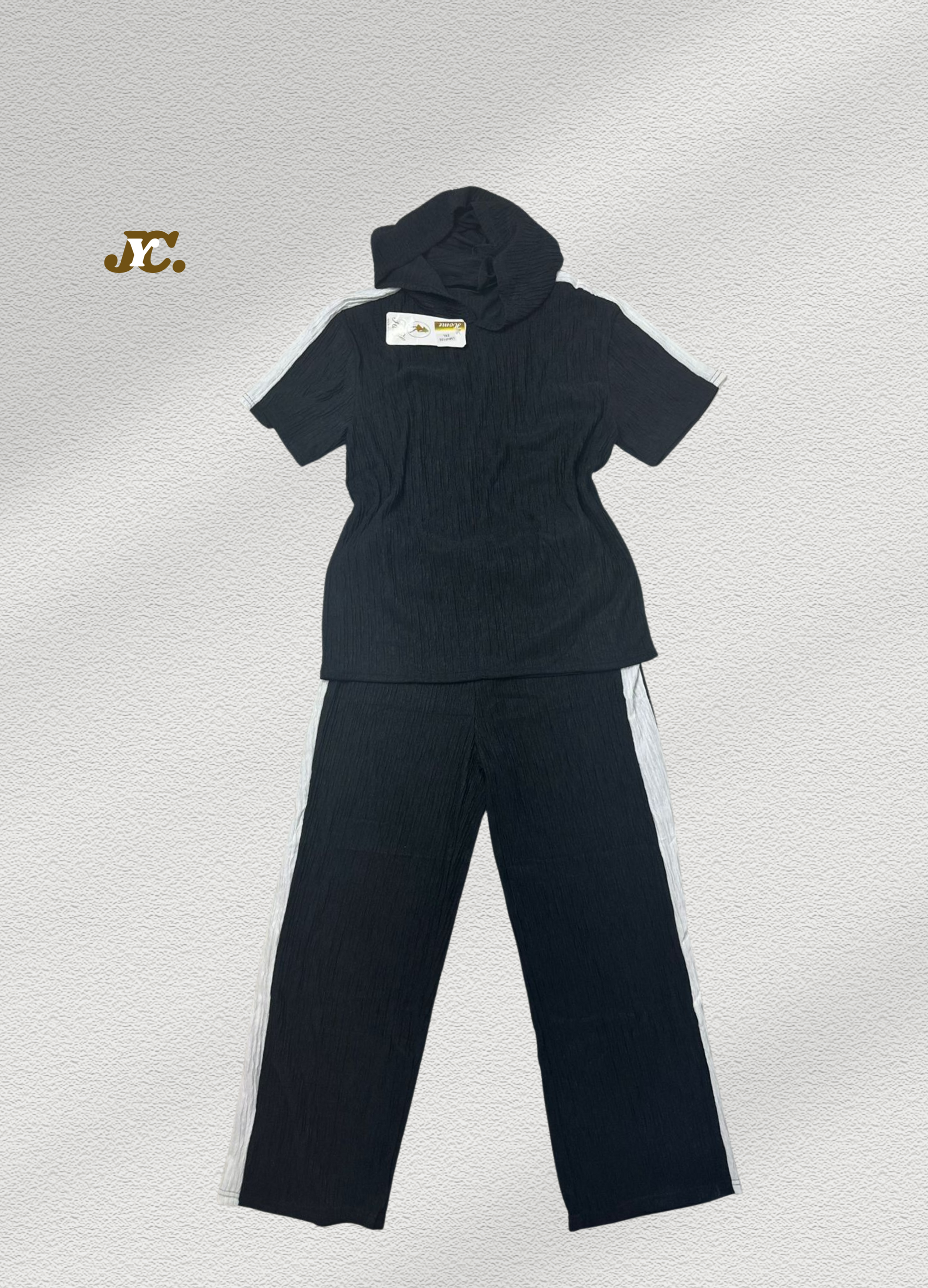 Stay effortlessly stylish and cozy with this Ribbed Co-ord Set featuring a hooded short-sleeve top and wide-leg pants. Crafted from a soft rib-knit fabric blend, this set offers a breathable, stretchable fit ideal for casual wear or lounging. The subtle vertical rib texture enhances the silhouette, while the contrast white side stripes add a sporty, modern edge.