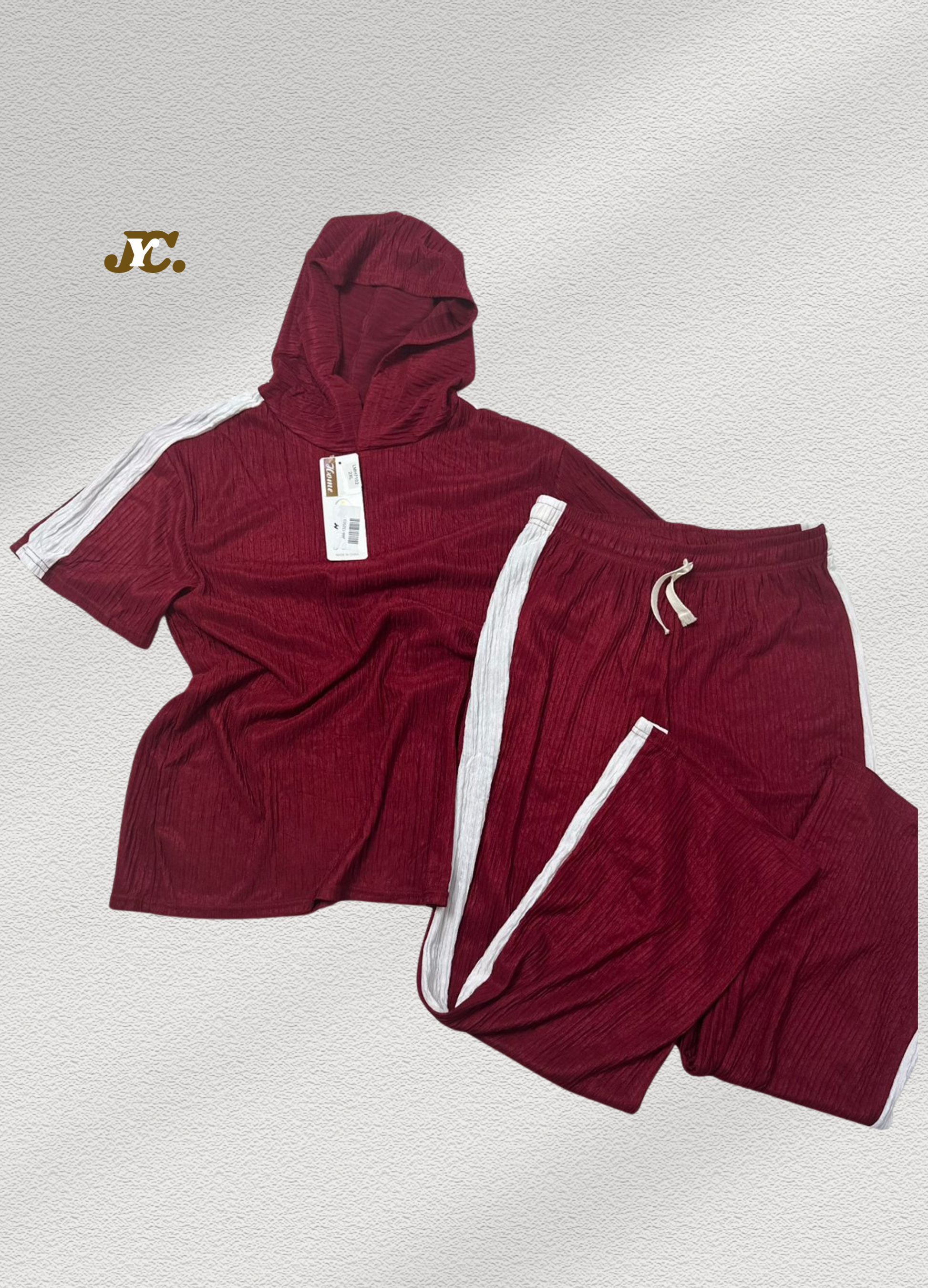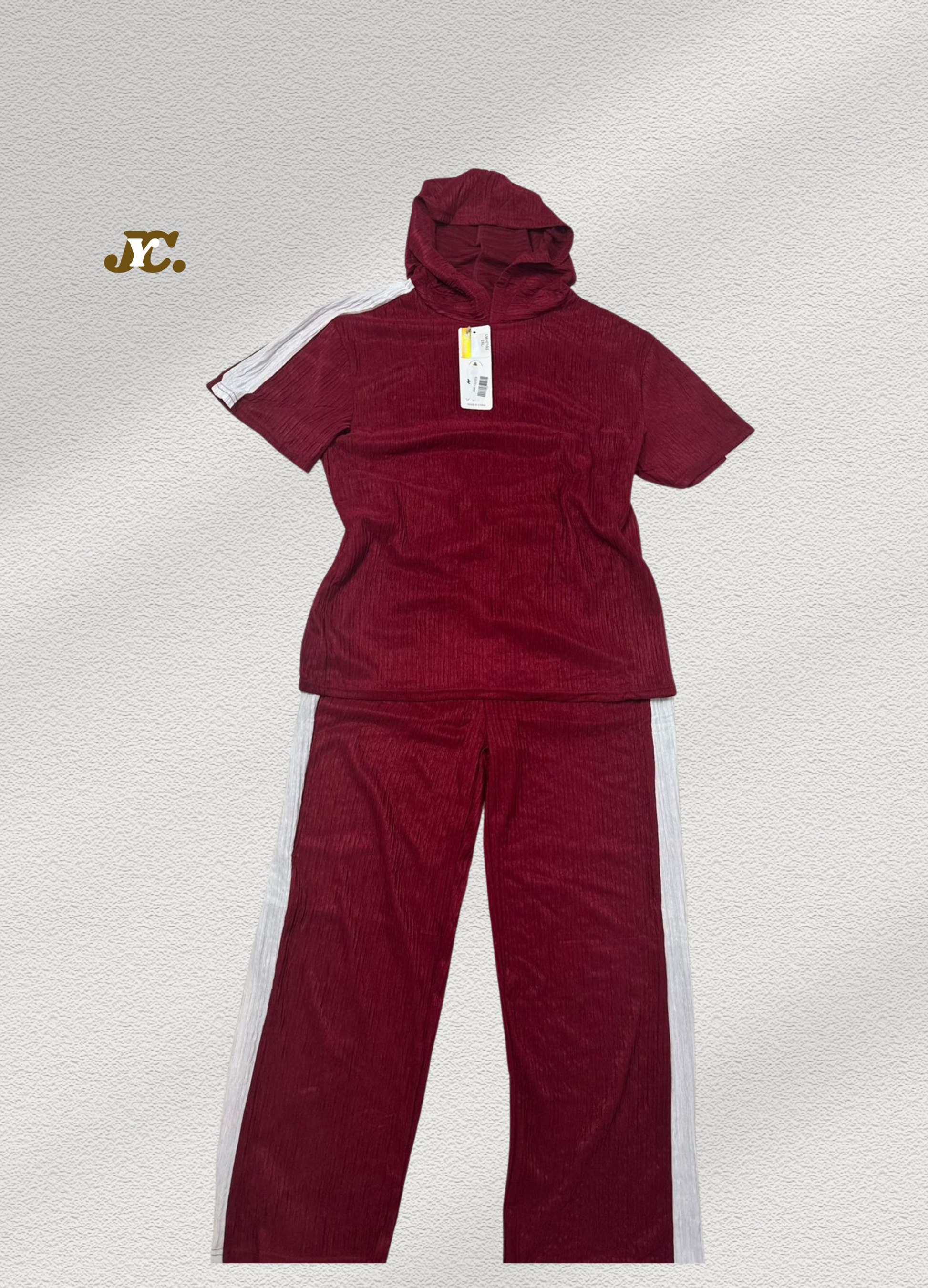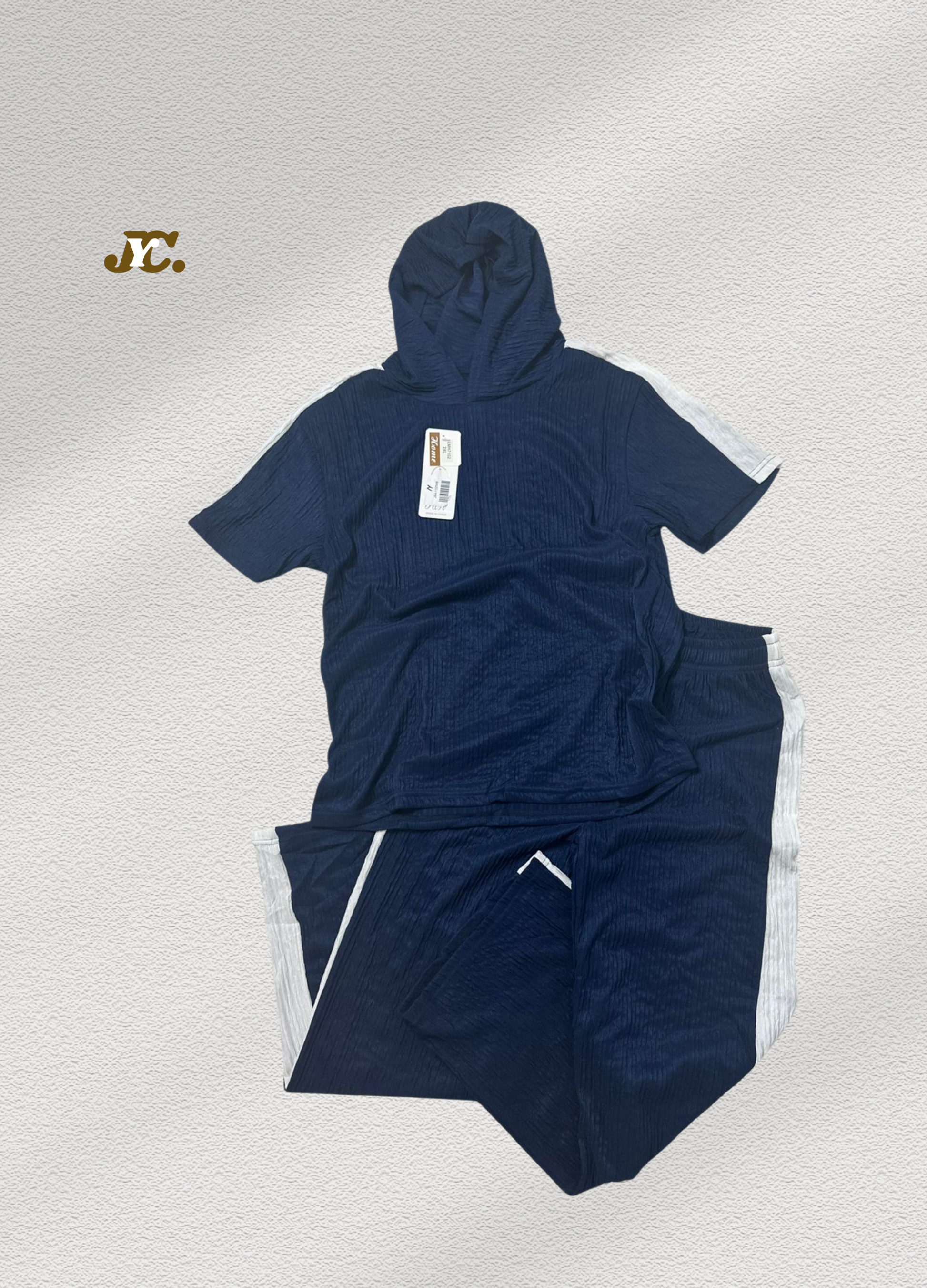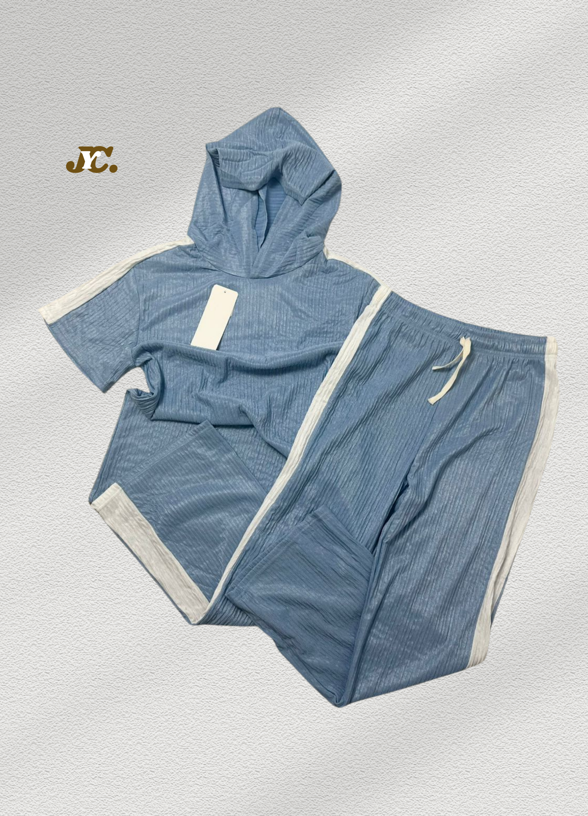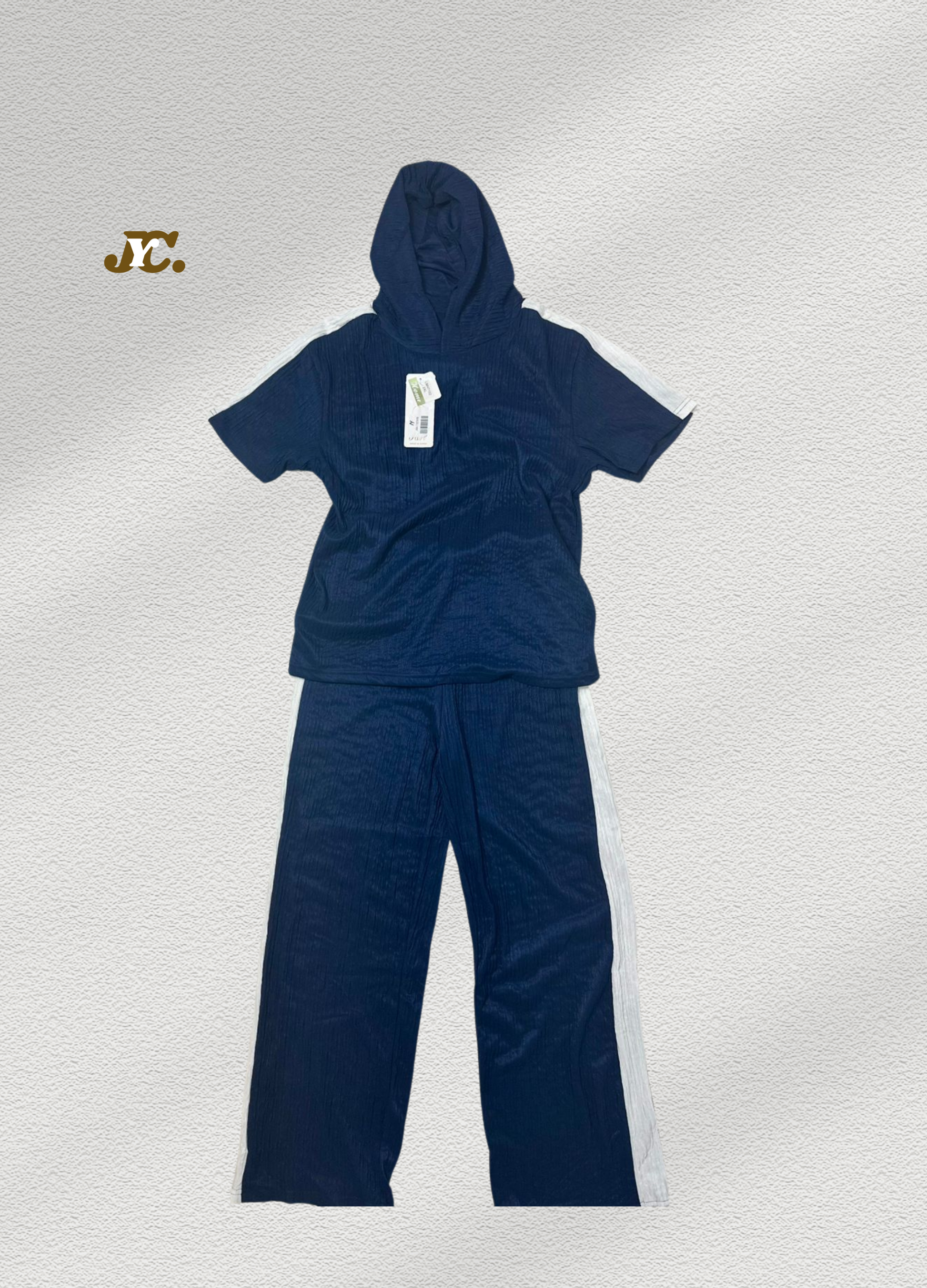 Stay effortlessly stylish and cozy with this Ribbed Co-ord Set featuring a hooded short-sleeve top and wide-leg pants. Crafted from a soft rib-knit fabric blend, this set offers a breathable, stretchable fit ideal for casual wear or lounging. The subtle vertical rib texture enhances the silhouette, while the contrast white side stripes add a sporty, modern edge.