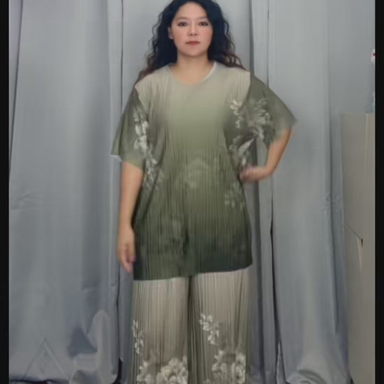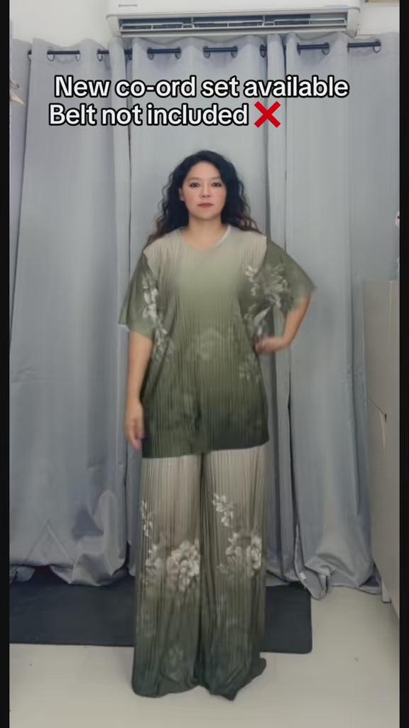 Step into effortless style with this beautifully designed two-piece pleated co-ord set, crafted for comfort and grace. Made from a premium fabric blend, it offers lightweight breathability with a naturally flowing silhouette. The subtle pleated texture and soft floral print on a gradient olive base make it perfect for relaxed days or elegant evenings.