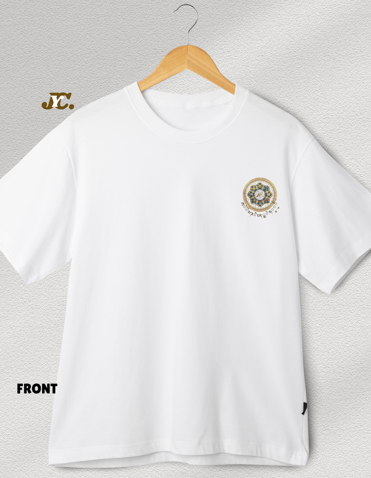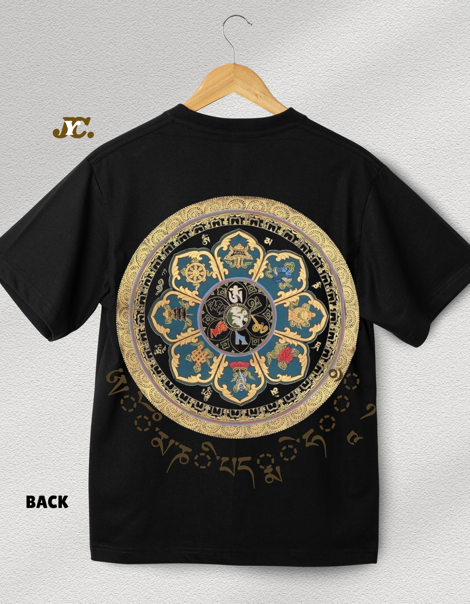 The front features a minimal Mandala emblem, while the back showcases a large, intricate Mandala circle with Tibetan script detailing—a design that reflects spirituality, culture, and artistic depth.